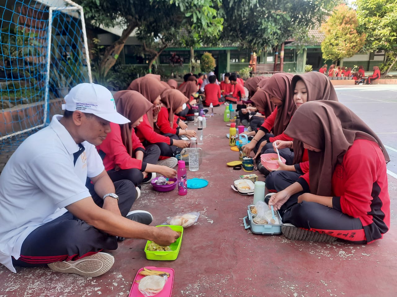 Setelah senam selesai, para siswa bersama guru dan staf madrasah menikmati makan sehat bersama. Makanan yang disajikan terdiri dari menu bergizi seperti nasi, sayur, lauk sehat, serta buah-buahan. Kegiatan ini tidak hanya bertujuan untuk menjaga kesehatan fisik, tetapi juga untuk menumbuhkan kebiasaan makan makanan bergizi di kalangan siswa.