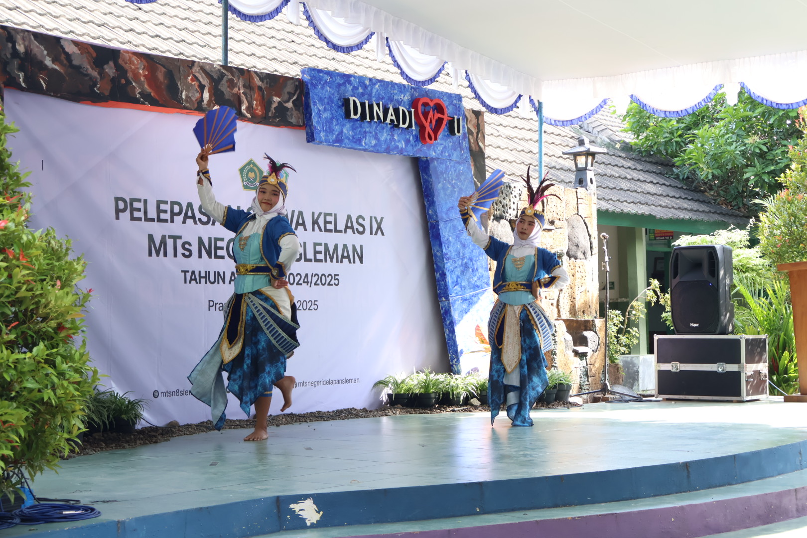 Sleman (MTsN 8 Sleman) โ Acara pelepasan siswa kelas 9 MTsN 8 Sleman Tahun Ajaran 2024/2025 yang digelar pada Rabu (11/6/2025) di halaman madrasah berlangsung meriah dan penuh warna. Salah satu penampilan yang mencuri perhatian adalah tari Greged Sembada yang dibawakan secara apik oleh dua siswi berbakat, Cantika dan Nayla. Dengan gerakan yang lincah, kuat, dan ekspresif, keduanya berhasil menghidupkan panggung serta menyulut semangat para penonton yang memadati halaman madrasah.