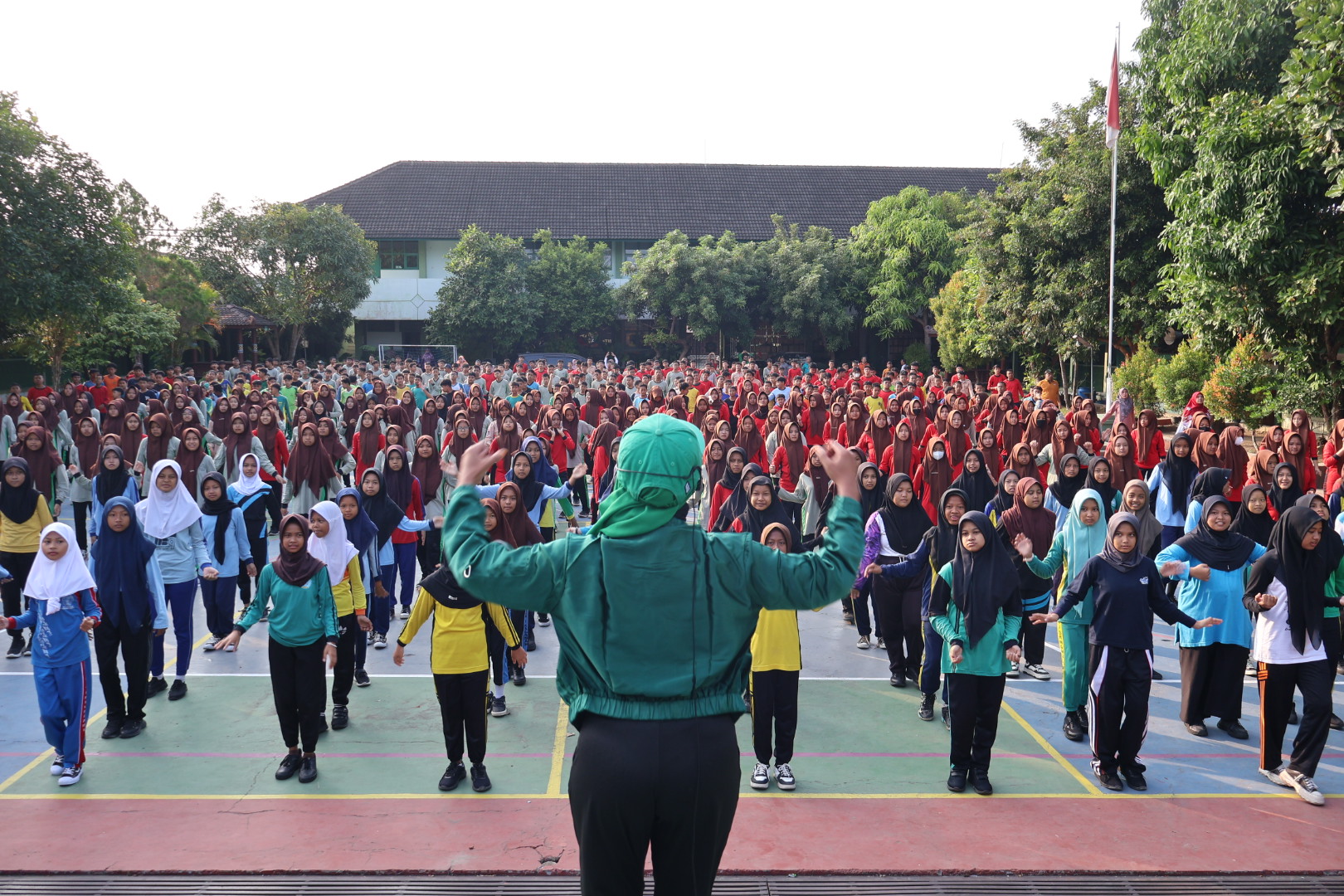 Sejak pagi, peserta telah memadati halaman madrasah dengan mengenakan pakaian olahraga. Gerakan senam yang enerjik dipandu oleh instruktur dengan iringan musik ritmis membuat suasana semakin hidup. Para siswa tampak antusias mengikuti setiap gerakan dengan penuh semangat, sementara para guru dan pegawai juga turut aktif bergerak mengikuti irama.
