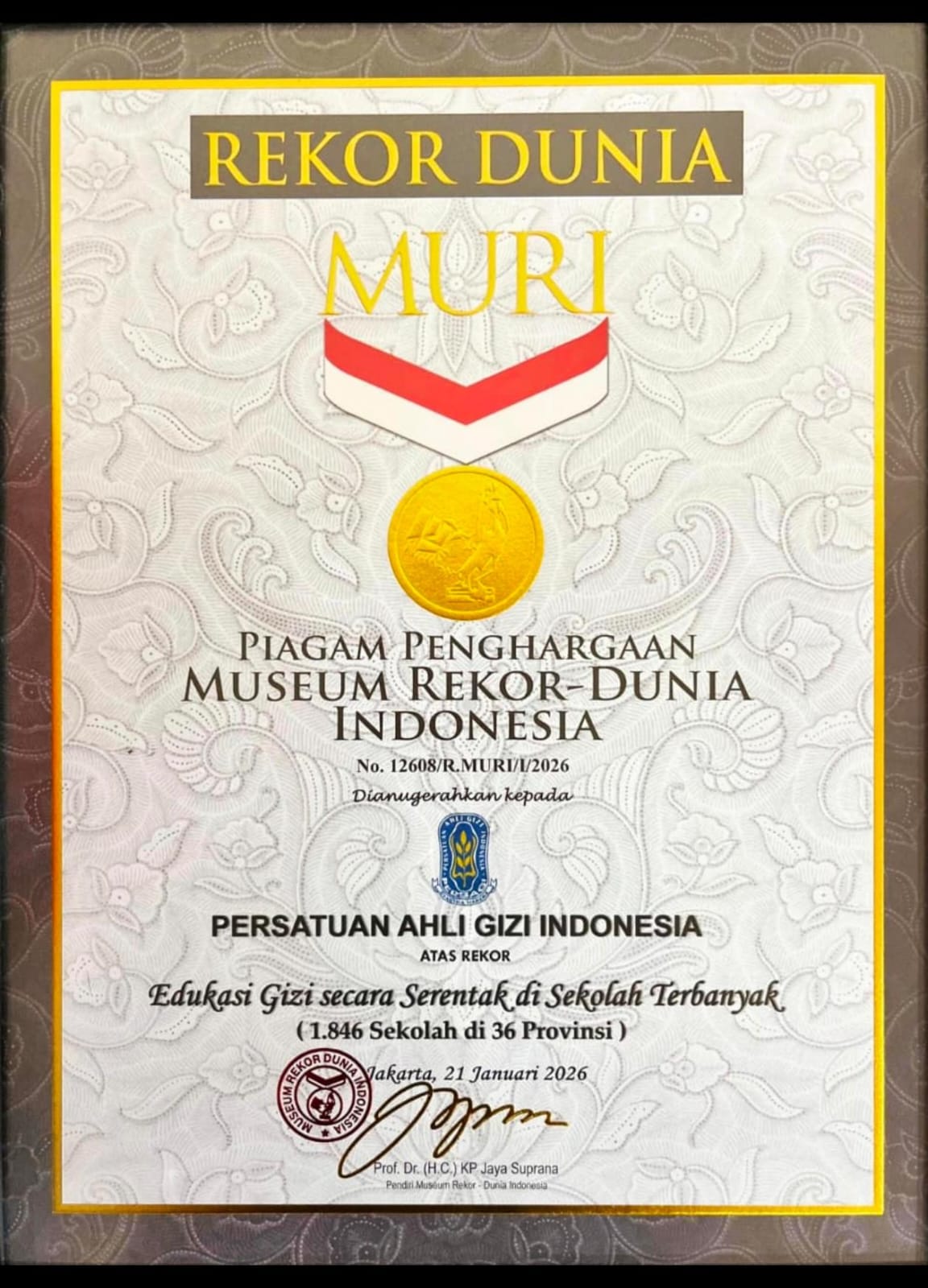 Pencapaian Rekor MURI oleh PERSAGI ini diharapkan menjadi tonggak penting dalam memperluas jangkauan edukasi gizi di satuan pendidikan serta memperkuat kolaborasi antara tenaga kesehatan dan dunia pendidikan dalam mewujudkan Generasi Emas Indonesia Tahun 2045. (idw)