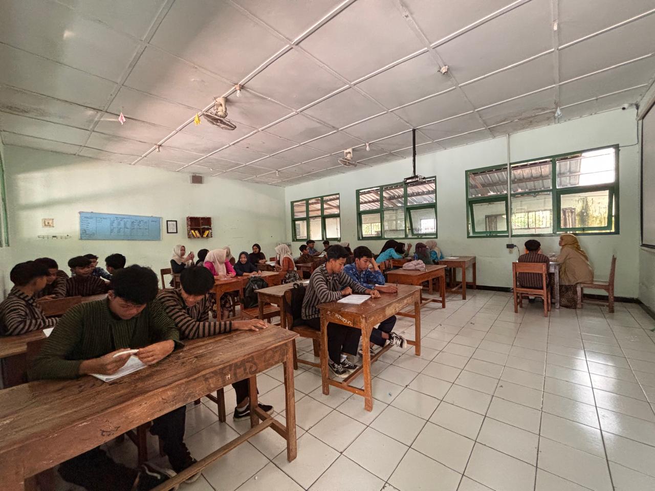 Para siswa mengikuti ujian dengan penuh kesungguhan. Mereka maju satu per satu untuk menyetorkan hafalan kosakata di hadapan guru penguji. Suasana kelas terlihat kondusif dengan siswa lain yang menunggu giliran sambil tetap mengulang hafalan masing-masing.