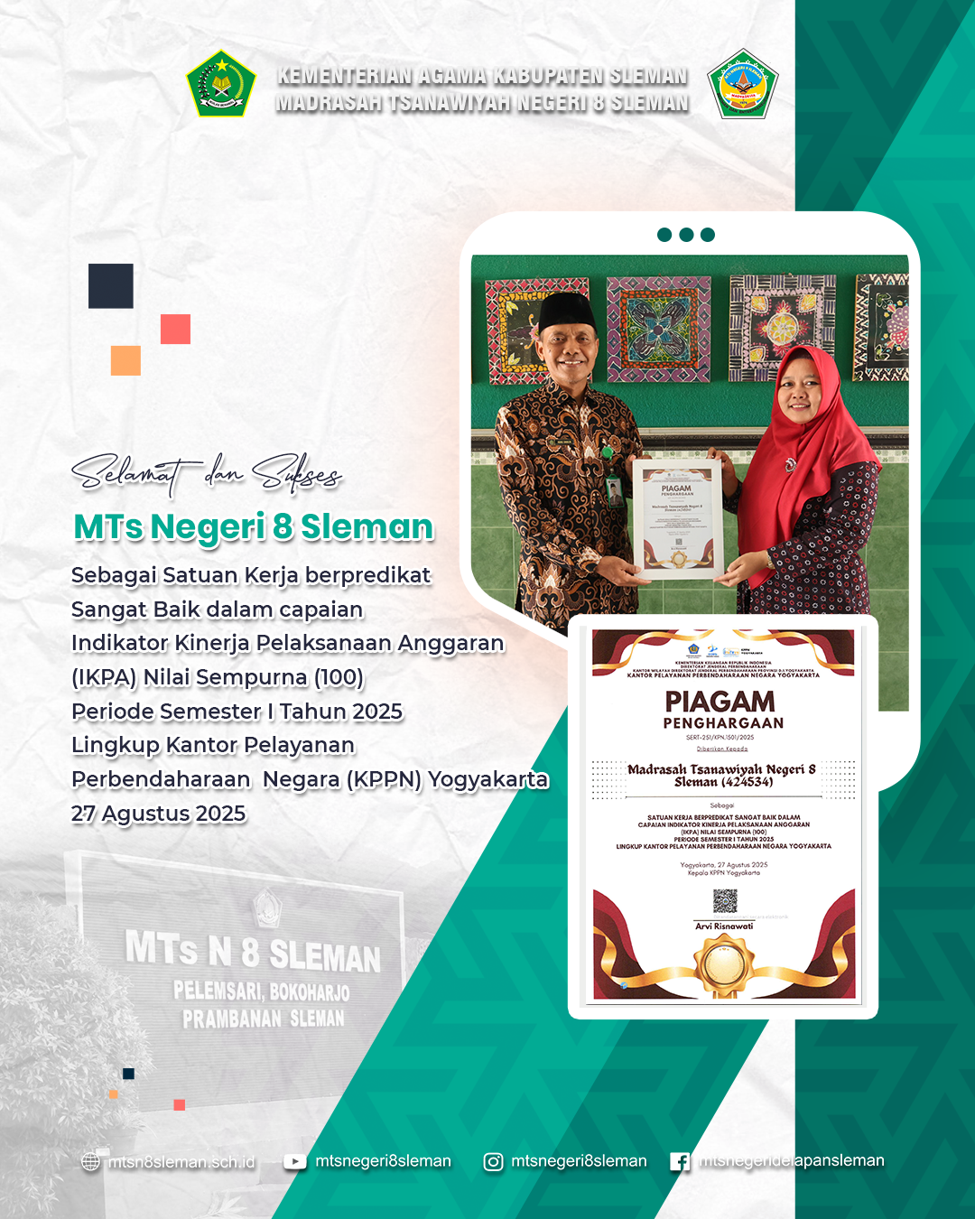 Akun resmi MTs Negeri 8 Sleman ๐ซ Pelemsari Bokoharjo Kapanewon Prambanan Kabupaten Sleman D.I. Yogyakarta โ๏ธ 0274-2850164